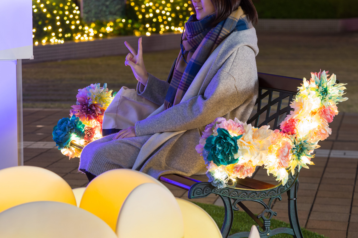 中央のオブジェだけでなく、周りに咲き誇るブルーやイエロー、ピンクといったカラフルな花々にも注目。撮影スポットとしてフラワーイルミネーションで飾られたベンチも用意されているので、座って記念撮影もいいですね。
