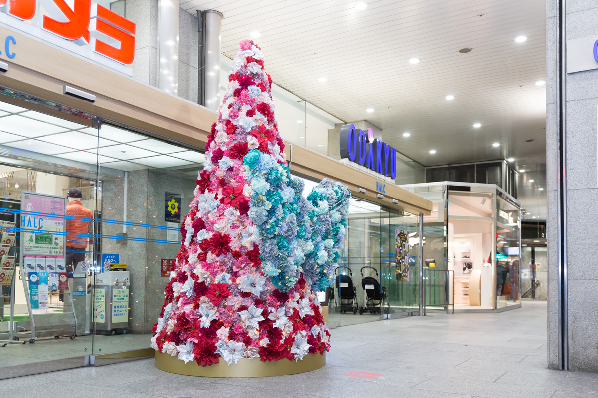 小田急エース館内には、8箇所にツリーも登場。フラワーオーナメントとボールオーナメント、そしてゴールドイルミネーションで演出された美しいツリーは、普段の通勤や通学、ショッピングの通路として行き交う人の目も楽しませてくれています。
