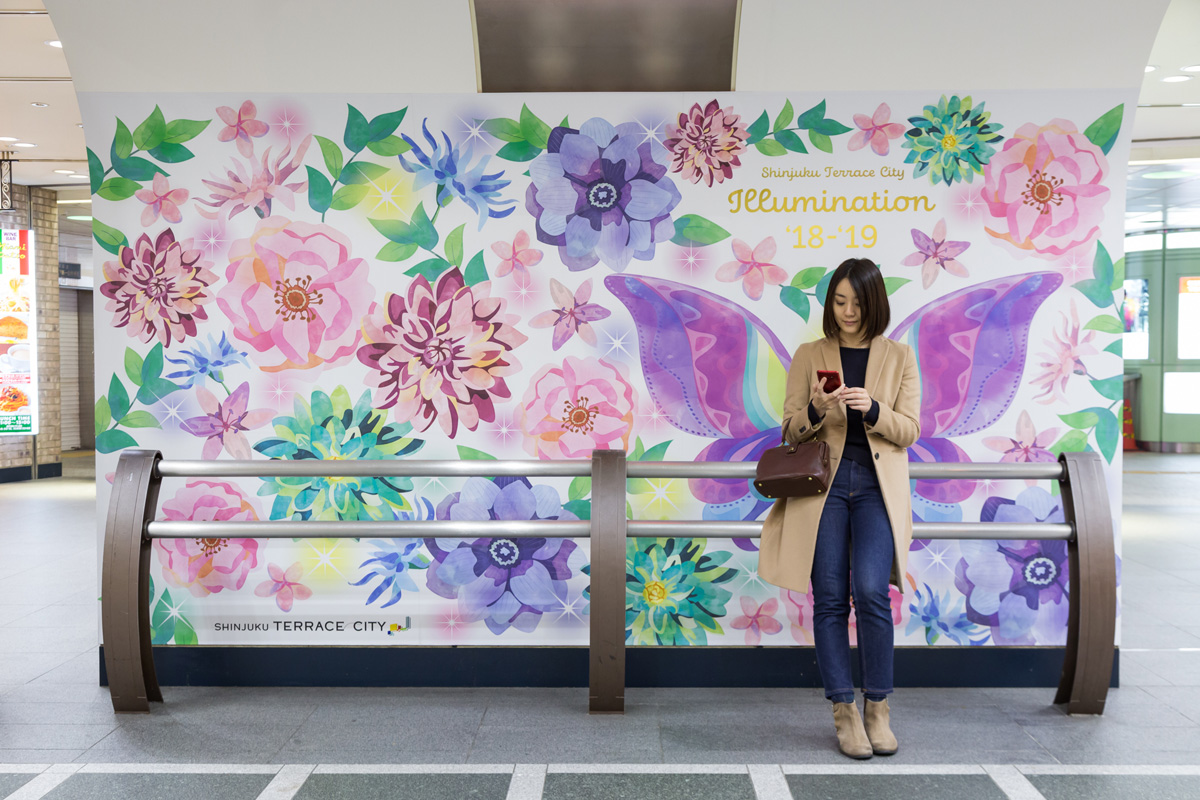 新宿駅西口地下街、西口交番近くのショッピングモール「小田急エース北館」にもフォトスポットが登場しています。美しいグラフィックで描かれた“妖精の羽”の前のベンチに座ることで、花の妖精になったような写真を撮ることができちゃいます。