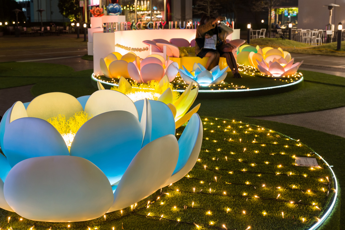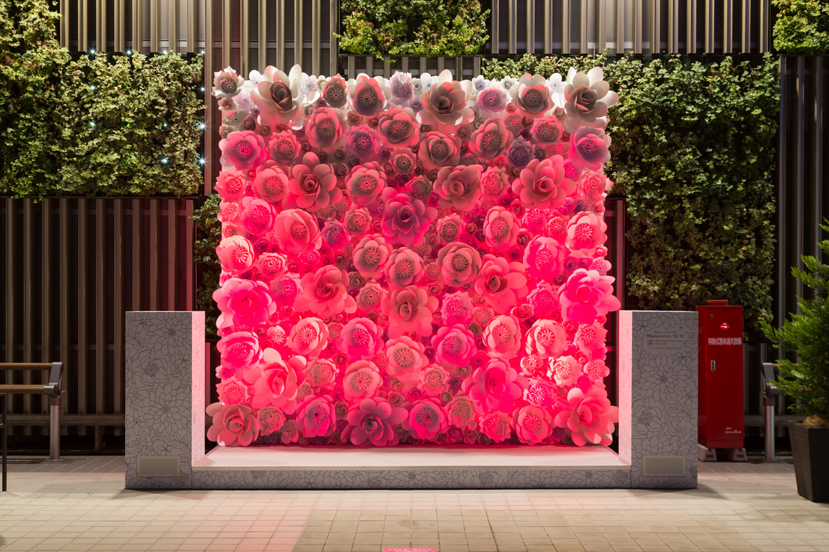 こちらのフォトスポットは、昼間でも立体的な白い花のアートウォールとして楽しめるのが特徴。夜と昼で違った雰囲気の写真を撮ってみるのもいいですね。