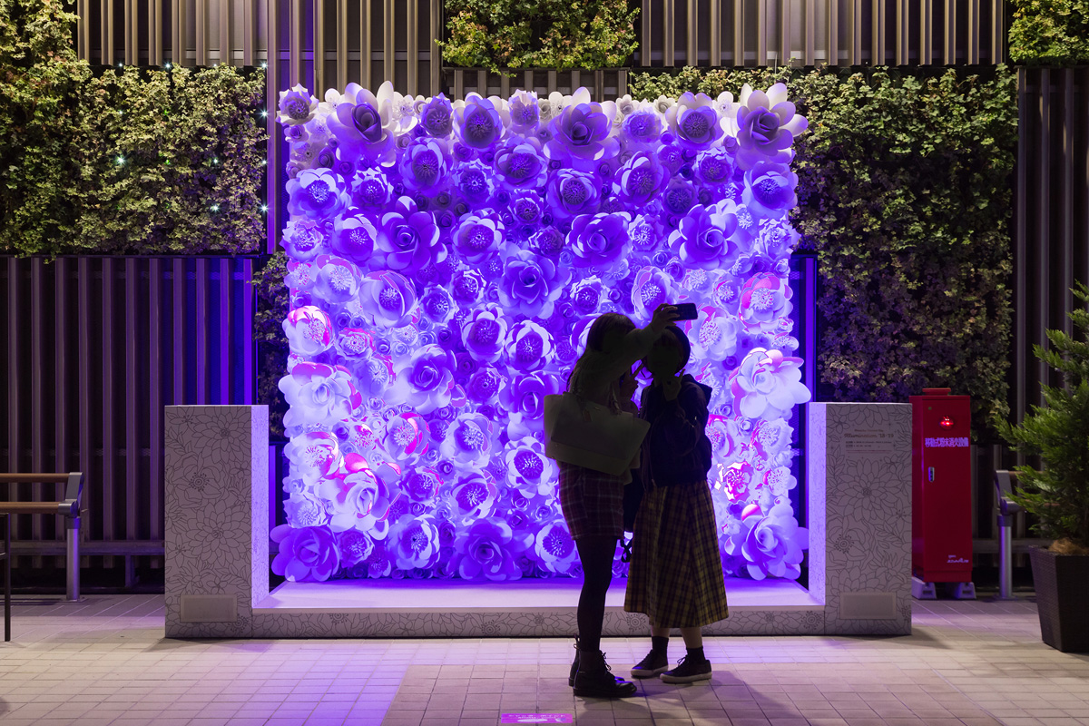 12月1日から点灯を開始した新宿サザンテラス広場の「ビッグフラワーパーク」もぜひ訪れて欲しいフォトスポット。いくつものビックフラワーが咲き誇り、その中心にある花の中に座って撮影を楽しむことができちゃうのです。かわいらしく、美しいフラワーオブジェは“映え”間違いなし!