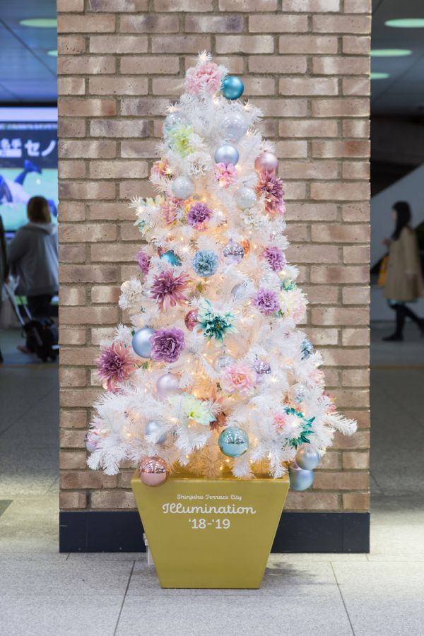 待ち合わせ場所にぴったりなのが、新宿西口ハルク入口前に登場した高さ3mの「フラワーツリー」。ピンクベースのオーナメントで彩られたツリーに、ブルーの花々が創り出す妖精の羽というキュートなデザインは「新宿テラスシティ イルミネーション」の象徴ともいえる存在です。