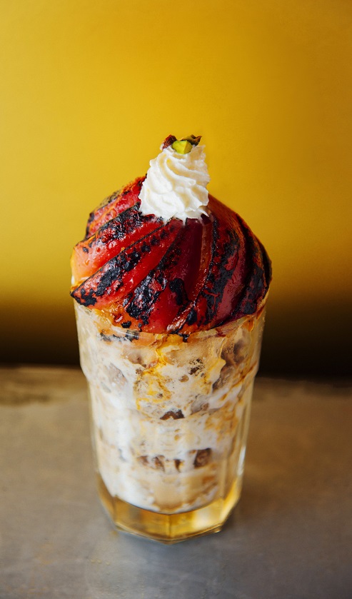 表面をキャラメリゼした焼きリンゴがのった、インパクトのある『ゴールデンブラウン』の「ベイクドアップル パフェ」1480円。アップルシナモンのシリアルや塩バターキャラメルアイスクリームが絶妙に絡み合い、大人の味わいに。※1日限定10食