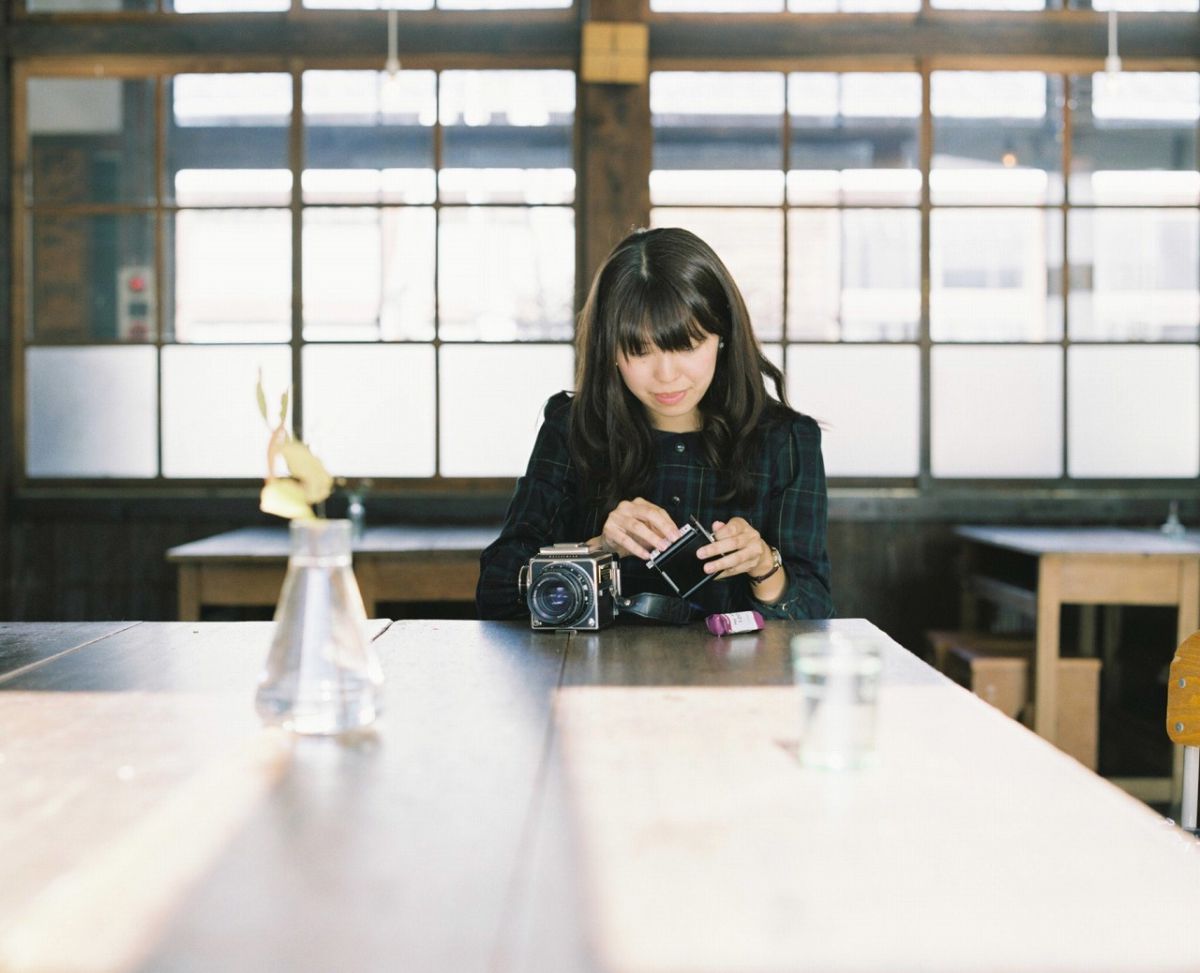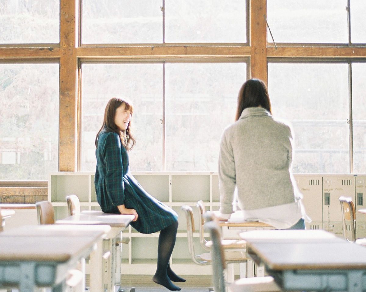 古い校舎には、古いカメラが似合いますね。1970年代のカメラにワクワクしながらフィルムをセットする友達。