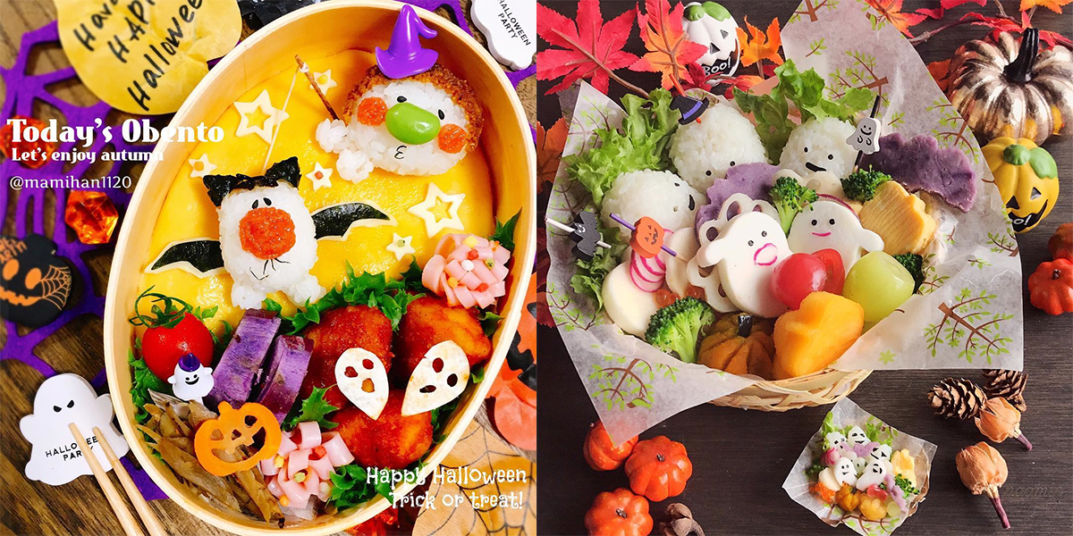 左 mamihan1120さんの作品:愛情たっぷりな旦那さまのお弁当だそう。職場でも注目間違いなしですね♪/右 iroha905さんの作品:おしゃれな籠盛り弁当。おばけたちがお話しているような雰囲気が楽しいですね。