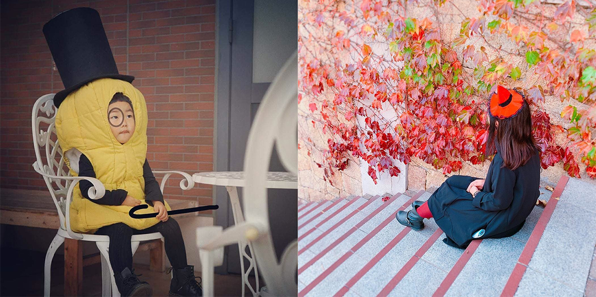 左 osesamayaさんの作品:なんとハンドメイドで作られた衣装だそう…!お子さんにぴったり似合っています♪/右 ruujunさんの作品:紅葉している蔦の葉っぱと魔女の衣装がぴったりマッチ!