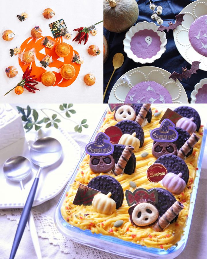 左上 littlewing0719さんの作品:しっとり×ほっこりなとっても美味しそうなかぼちゃのマドレーヌ。ラッピングもステキ♪/右上 toitoitoi_ringさんの作品:紫芋と甘酒のポタージュが、蜘蛛の巣やおばけアートでぐっとハロウィンらしく/下 noncafe.iさんの作品:かわいいデコレーションだけではなく、中は紫いもプリンやレアチーズケーキ、かぼちゃクリームなどが層になっているそう! こだわりのお味も堪能してみたい♪