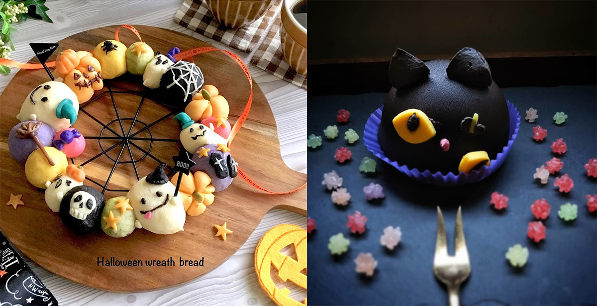 左 kiyochannnさんの作品:おばけやかぼちゃモチーフのカラフルで楽しげなリース! コレ実は“パン”だそう。食べるのがもったいない…!/右 mint.tea.7さんの作品:ハロウィンらしい黒猫モチーフは、なんとコンビニスイーツだそう。雰囲気のあるスタイリングが目を引きました♪
