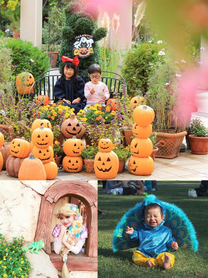 上 yonekayoさんの作品:ジャック・オー・ランタンやお花に囲まれた、魔女の宅急便のキキ&トンボ。作品から優しい雰囲気が伝わってきます/下左 細部まで再現されたラプンツェルの仮装。とても手が込んでいます/下右 赤ちゃん孔雀の笑顔に編集部もメロメロです…