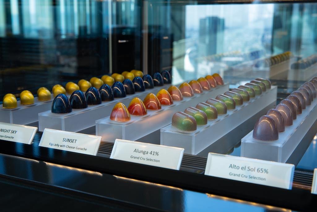 酒粕にホワイトガナッシュを合わせた「GOLDEN SUN」や、むしろ麹製法で作られた天然醸造醤油の味わいを楽しめる「NIGHT SKY」など、海外からのゲストも意識した和の食材とチョコレートのマリアージュはもちろん、太陽の光や夜空、夕焼け空をイメージした繊細な見た目とネーミングにも注目です。