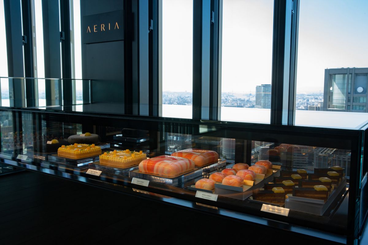 2018年7月に、ホテル「コンラッド大阪」初のスイーツショップとして最上階にオープンしたパティスリー「アエリア」。ラテン語で「Airy(空気のような)」の意味を持つ店名の通り、周囲を空に囲まれた開放的な空間が広がります。