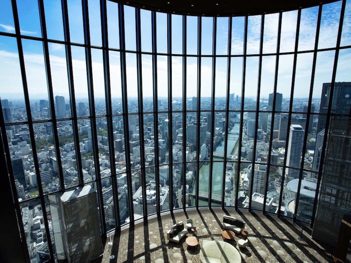 エレベーターで40階に着くと目の前に広がる絶景!「アエリア」では、時間とともに変化するこの空の表情にインスパイアされた、美しいケーキやチョコレートボンボンを購入できます。