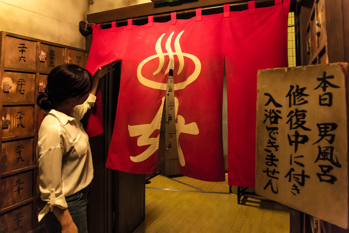 銭湯の暖簾や下駄箱も再現。女湯の暖簾の奥にはタイル貼りの浴場や富士山のペンキ絵が。実はここ、1階と地下2階へ通じる階段の踊り場なんです。