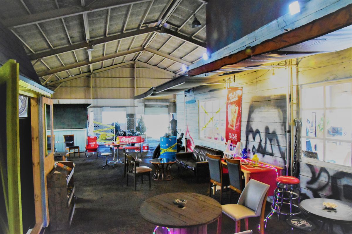 もともと鉄工場だったところリノベーションした話題のカフェ「秘密基地akari(あかり)」。工場の雰囲気はそのままに、天井が高く開放的。アメリカン雑貨なども並びます。