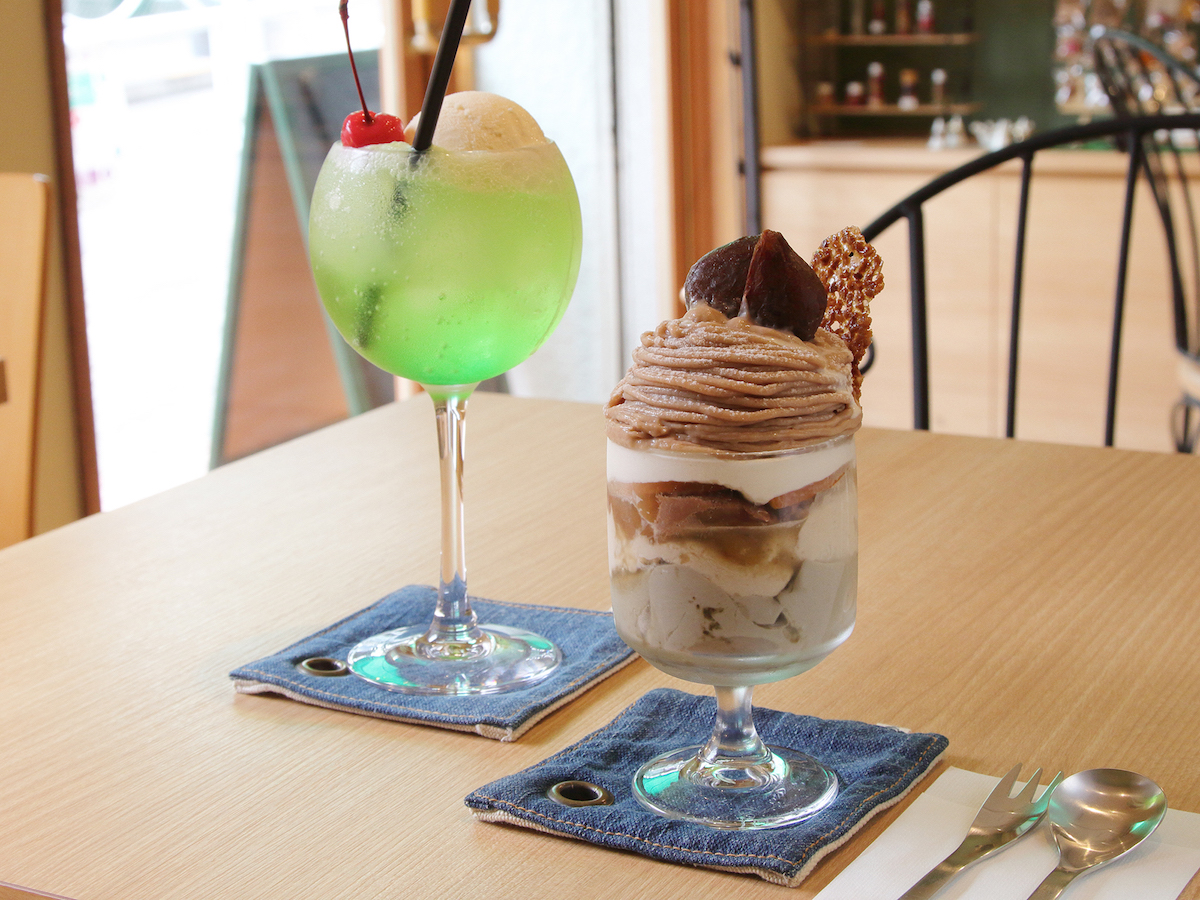 今日は、これから冬にかけて旬を迎える「栗」を使った期間限定の「栗のパフェ」(1200円)と、定番の「クリームソーダ」(650円)を、オーダーしてみました。