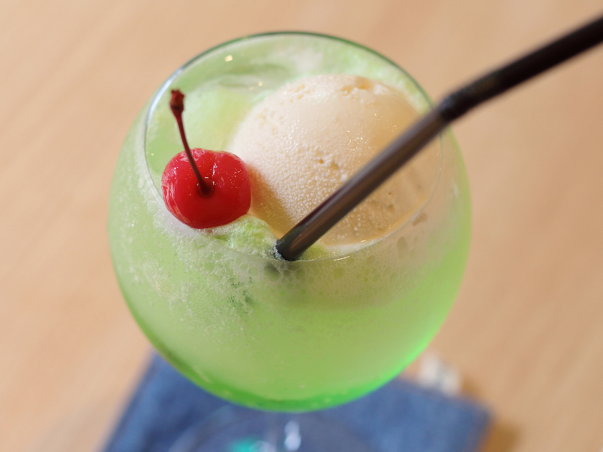 丸いグラスにたっぷり入ったメロンソーダは、バニラアイスが少し溶け出し、独特の甘さとおいしさ!幼少期の記憶が蘇る、懐かしさも感じさせてくれる1杯です。