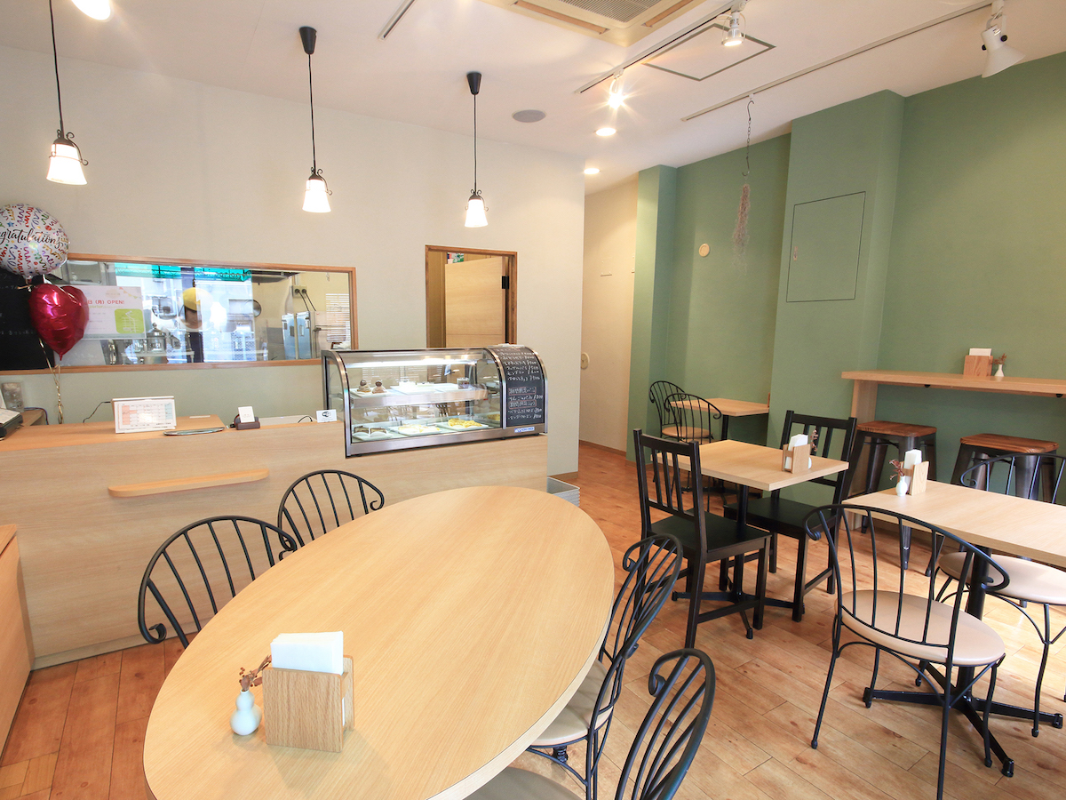 グリーンの壁が印象的な明るい店内は、4人掛けのテーブル席が1つと2人掛けのテーブル席、1名様のカウンター席があるシンプルな作り。隅々まできれいな店内は、ついつい長居したくなる居心地のよさに満ちています。