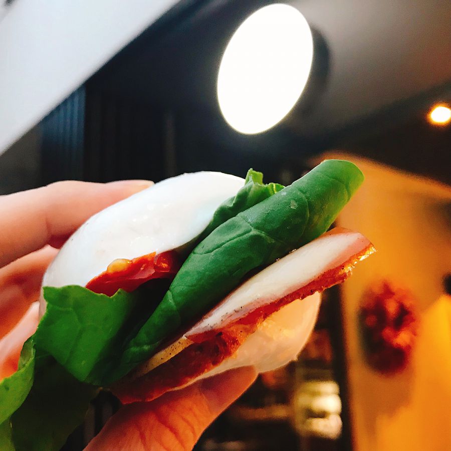 この店舗だけで味わえるのが、「出来たてモッツァレラバーガー」。メニュー名を聞いて、バンズにチーズを挟んだハンバーガーを想像したら大間違い。なんと、こちらはモッツァレラチーズをバンズに見立て、中にトマト、ルッコラ、バゲット、生ハムを挟んだ大胆発想の一品なんです!