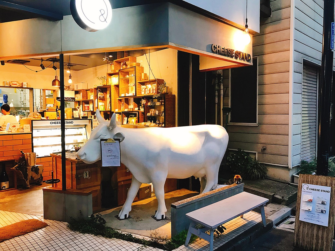「アンドチーズスタンド」の目印は、こちらの大きな白い牛のオブジェ。「シブヤチーズスタンド」にも同じものが飾られていて、お店の目印になっています。オブジェの前に置かれたベンチでは購入したフードやドリンクをいただくこともできます。