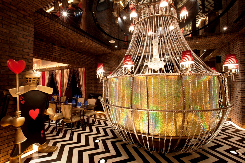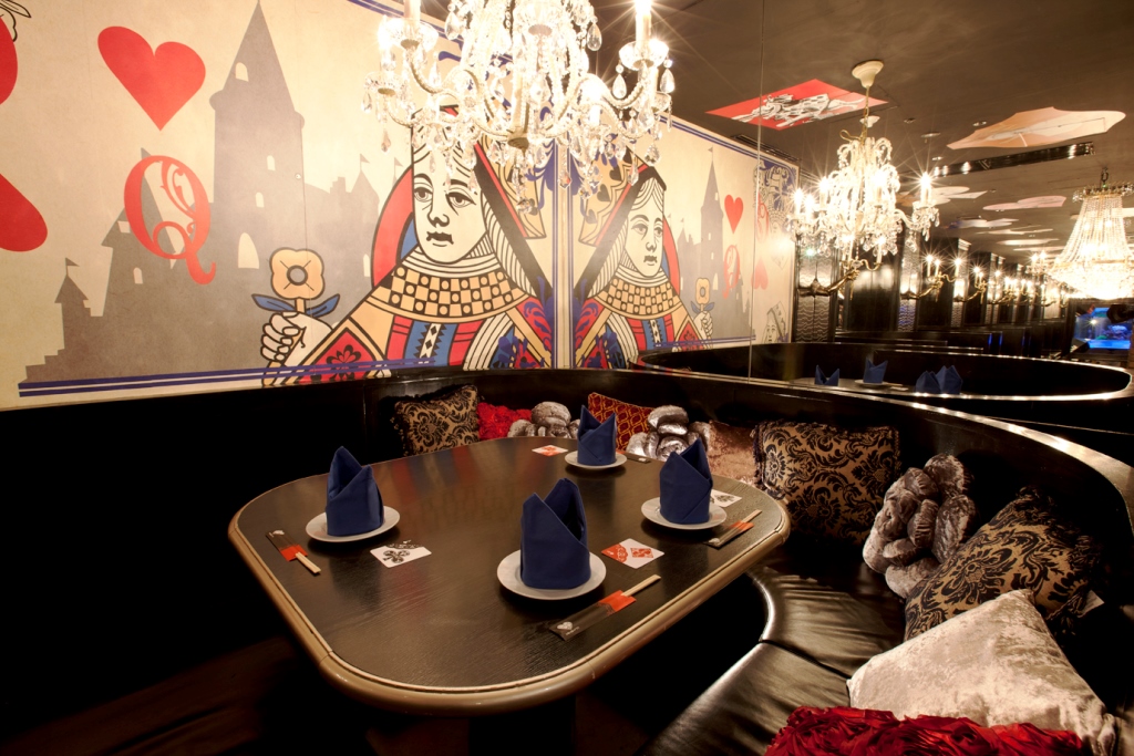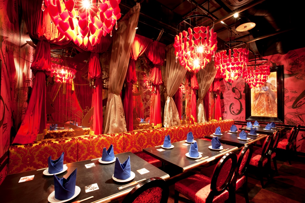 シャンデリアの中で幻想的なひとときが過ごせる「ビッグシャンデリアシート」ほか、赤と黒を基調としたゴージャスな女王の城内にはさまざまなタイプのシートがあるので、お好みの席でアリス・ワールドを満喫して。
