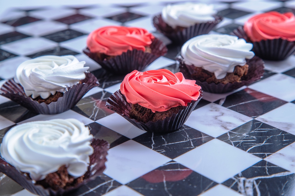 ホールケーキだけでなく、小さなスイーツたちも注目!ハートの女王様のお城の庭園に咲き誇るバラを思わせる、ローズやホワイトの「一口バラケーキ」はとてもフォトジェニックです。
