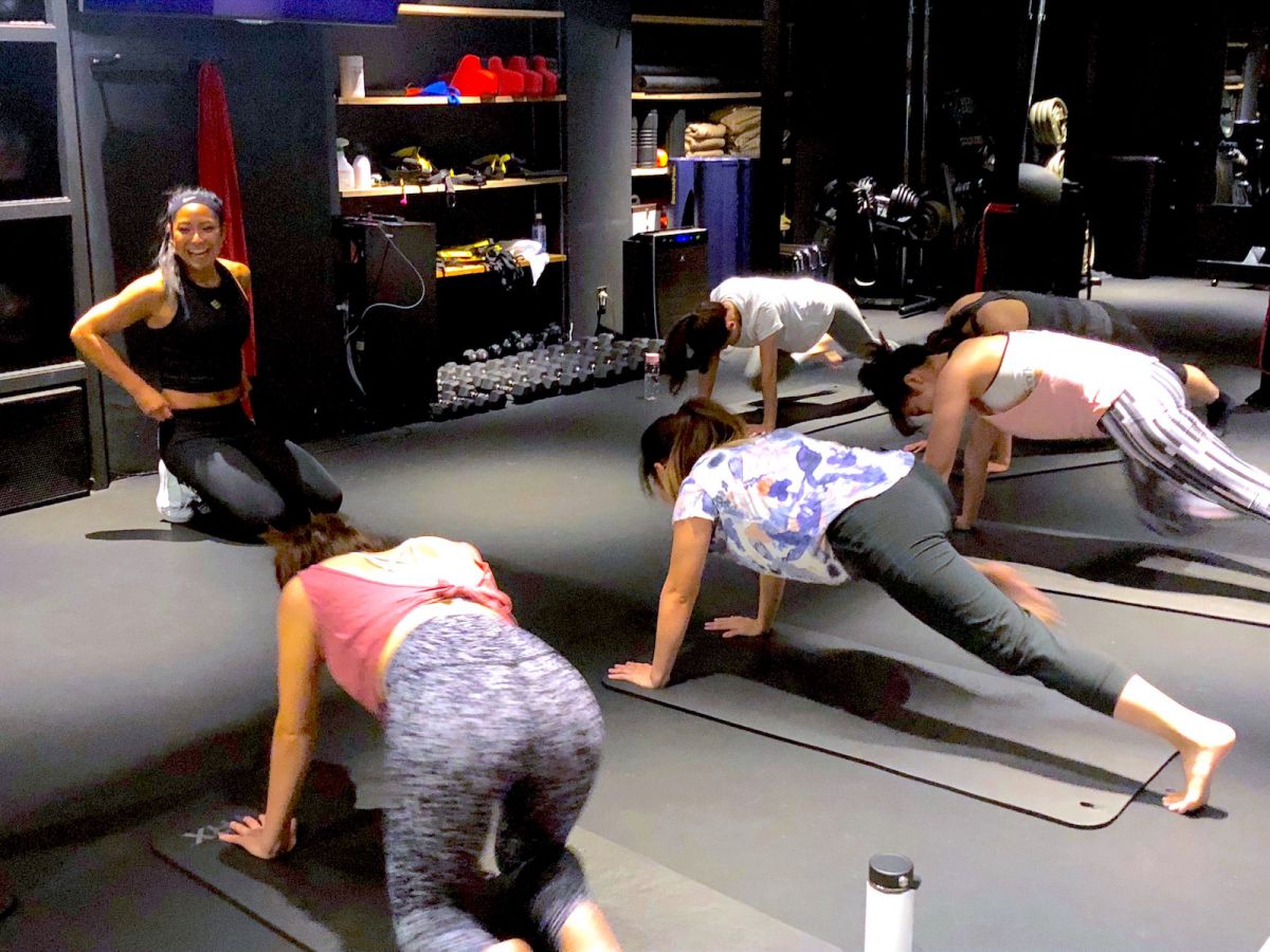 最後は全員で輪になってのグループワークアウトです。すでに全身プルプルですが、コーチの叱咤激励のおかげでやり抜くことができました!床に倒れこみながらも、全員がスッキリとした表情で笑っていて、達成感もひとしお。