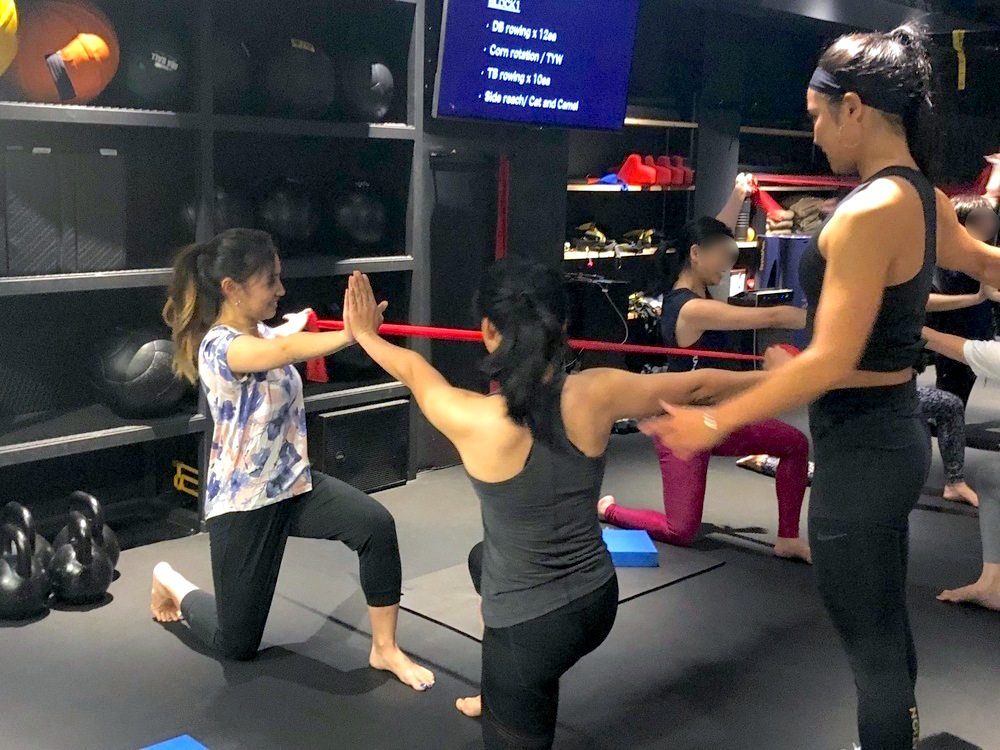 続いては、2人1組のペアワーク。チューブを引っ張り合うことで、全身の連動性を高めます。姿勢をキープするために、腕だけでなく全身がフル稼働!キツさはどんどん増していき、パートナーと顔を見合わせて笑ってしまうほど。体育の授業や部活を思い出すような、賑やかな雰囲気が新鮮で楽しい!