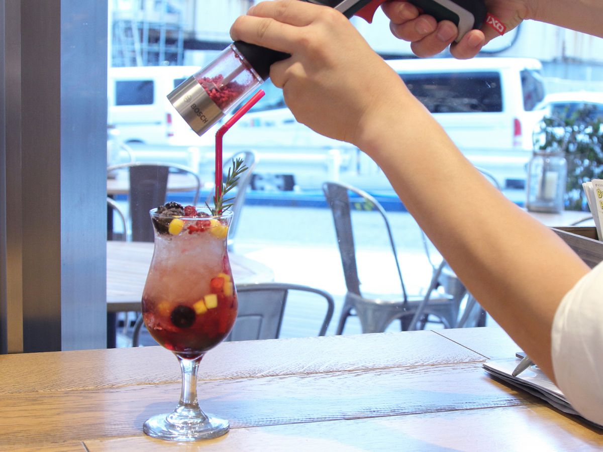 こちらは「ミード」と呼ばれる蜂蜜酒がベースで、フルーツをたっぷり加えたサングリア仕立ての1杯。スタッフが「Bosch」の電動工具を使用して、フランボワーズを目の前でかけてくれるパフォーマンスも楽しめますよ。