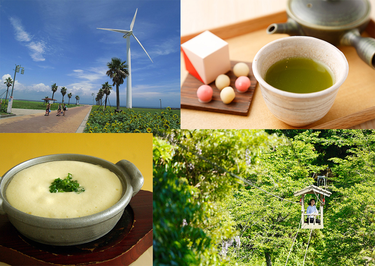 浜名湖が太平洋と接する今切口のすぐ西側。海湖館は貝や流木を組み合わせたフォトスタンドなどが作れるクラフト体験工房。食堂でスズキのフライをのせた出世丼や生シラス丼なども味わえます。毎月第1土曜の9~12時は、地場産品を販売する朝市をお楽しみに。
