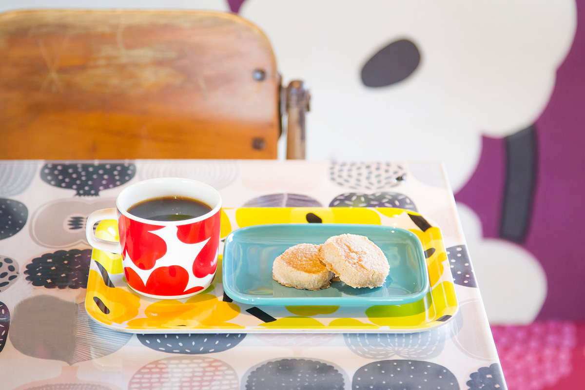 リノベーションしたのは、注文住宅やリフォーム、北欧インテリアショップなどを手掛ける地元企業・都田建設。北欧のライフスタイルを提唱していて、使用する食器も全部マリメッコです。古材と北欧インテリアが不思議に調和した空間で、コーヒー&手作りクッキー(500円)をのんびり味わって。