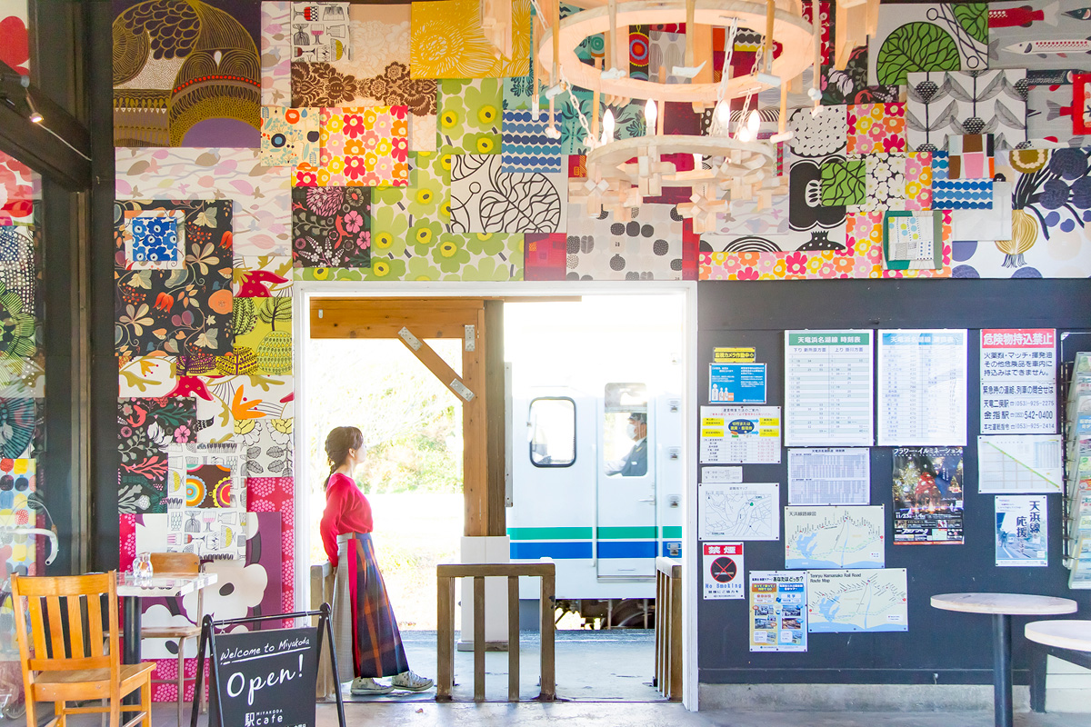 壁にマリメッコのカラフルポップなファブリックパネルをたくさん飾ったこの場所、なんと単線電車の無人駅なんです。場所は掛川駅~新所原駅を結ぶ天竜浜名湖鉄道(通称・天浜線)の、中間あたりにある「都田駅」。無人の待合室と薬局だった駅が、2015年、待合室と一体化したおしゃれなカフェに!駅舎やプラットホーム、検札台はそのまま残っていて、スローでのどかな空気感がなんとも素敵です。