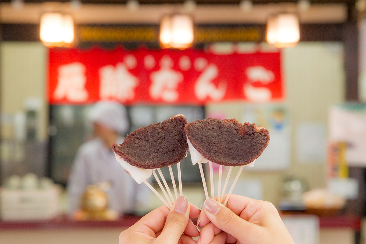 散策のひと休みに、だんご茶屋の名物「厄除団子」(1皿200円)はマスト!起源は江戸時代、13代将軍・徳川家定公の頃、登城の土産に献上されたことだそう。頭、首、胴体、手、脚を表す約3cmのお餅それぞれを計5本の串で刺しているのは、厄除の意味があるという説も。店内の赤い暖簾を背景にぼかして入れたら、こんなノスタルジックな写真が撮れました。