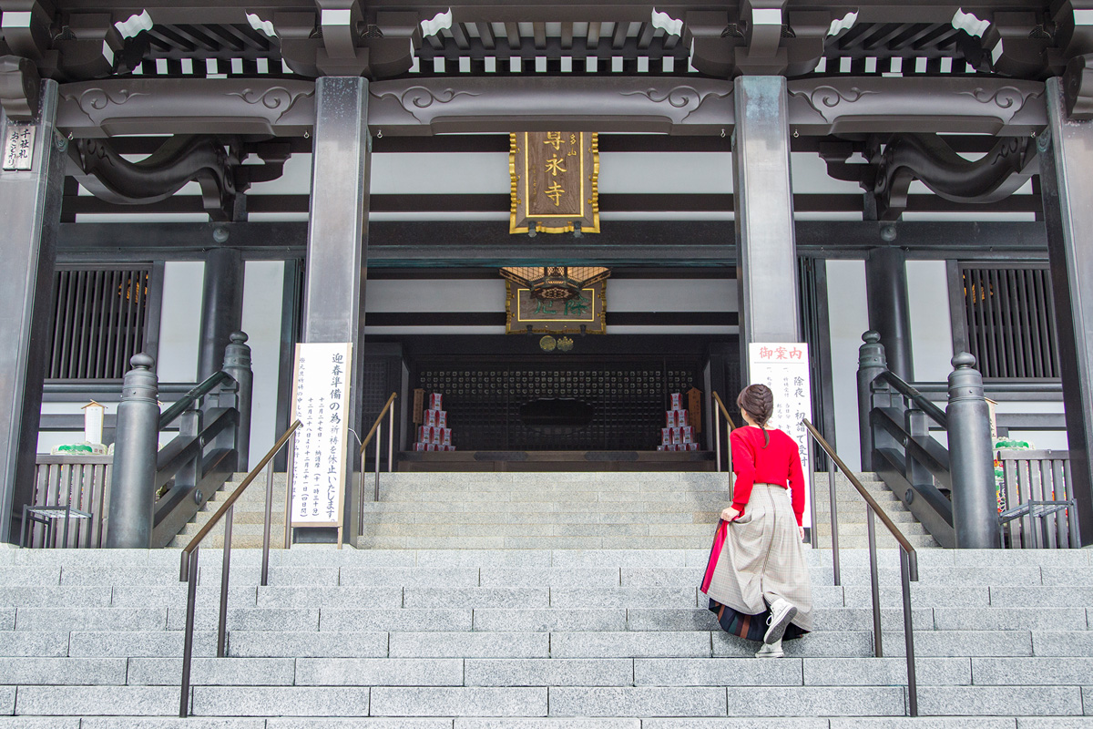 約1290年前に開山したといわれ、厄除観音と呼ばれる「法多山 尊永寺(はったさん そんえいじ)」。広大な境内は深い森のようで、清冽な空気が満ちています。国指定重要文化財の重厚な造りの仁王門から歩いて15分ほど。長い石段を上った先にある本堂で、お参りをしましょう。