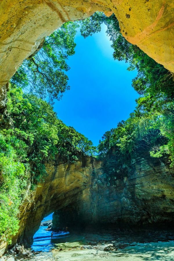 下田市にある「龍宮窟(りゅぐうくつ)」は、崖が波に削られてできた海食洞。洞窟の天井は一部が崩れ、直径約50mの天窓に。散策道を登っていくと、ぽっかりと開いた穴がハート形に見えるポイントがあり、写真を撮ると恋愛運が上がるといわれ人気なんですよ。