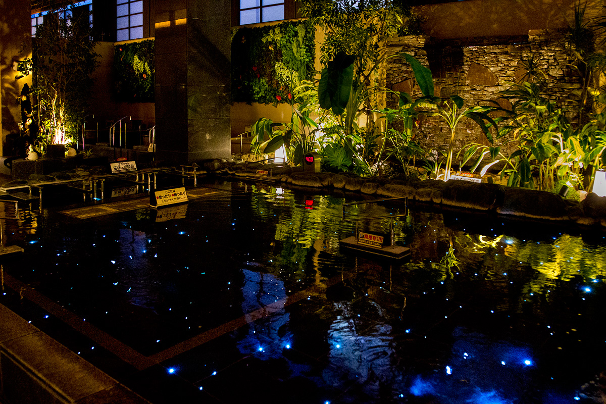 7色に光る「ほたるの炭酸泉」など、14種を湯めぐり