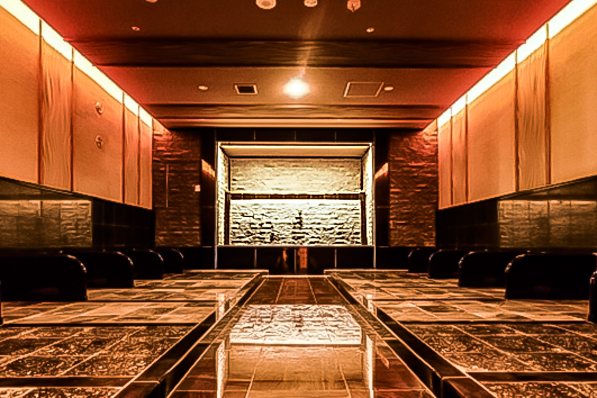 1階は大浴場や畳の休憩広間、食事処、2階は岩盤浴房やエステなどがあります。まずは大浴場で温泉に浸かりましょう。