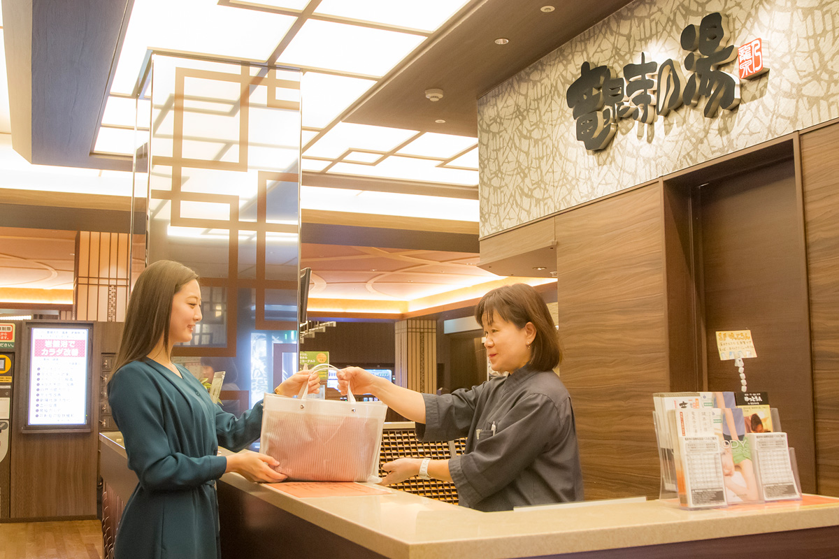靴をシューズロッカーに預けたら、券売機でチケットを購入し、ゲートを通って館内へ。岩盤浴衣&タオルはカウンターで受け取ります。