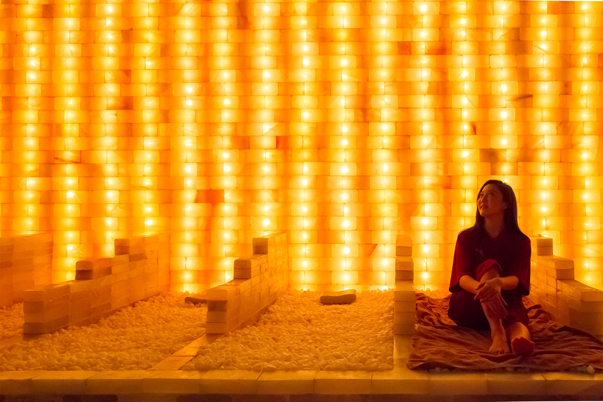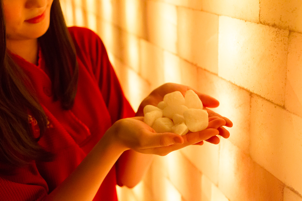 壁も床もぜ~んぶヒマラヤの天然岩塩なんですよ。ミネラル成分たっぷりの岩塩に囲まれると、岩塩の酸化還元力で有害活性酸素を除去し、皮膚の老化やトラブルを防止する効果が期待できるんだそう。
