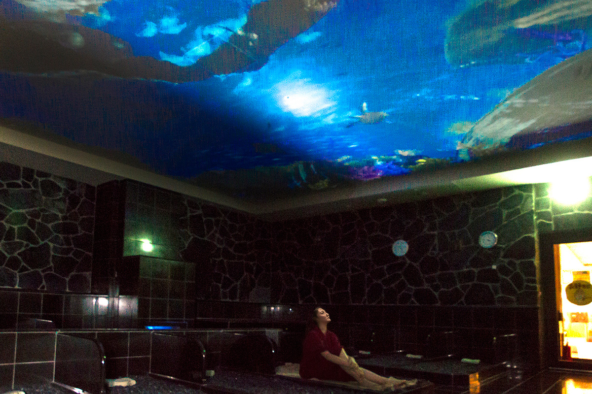 7種の岩盤浴房があり、写真の「アロマゲルマ房」では、天井にプロジェクションマッピングの映像が映し出されます。10分間のインターバルで、海ver.と空ver.の映像を用意。海ver.を寝ころんで見上げると、魚の群れやウミガメ、マンタ、クラゲが行き交い、まるでスキューバーダイビングをしているみたい!