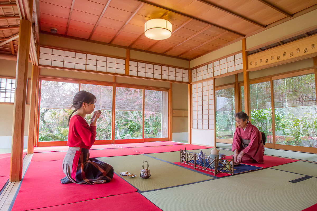 庭園を望む茶室で茶道体験すれば、お行儀よく背筋がピンと伸び、ステキ女子に近づいた気分に♪