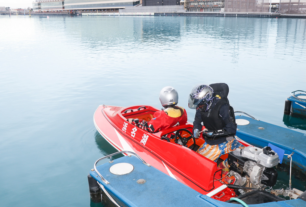 本番のレースは時速約80kmで走行する1人乗りボートですが、ペアボート体験用は2人乗り。同乗して操縦するのはプロのボートレーサーです。ヘルメットやライフジャケット、カポックと呼ばれる防護服を身に着けて、ボートの前方席に乗り込みます。正座を崩した形で両膝を船の内部にぴったりとつけ、左右の取っ手をしっかり握って、さあ出発。