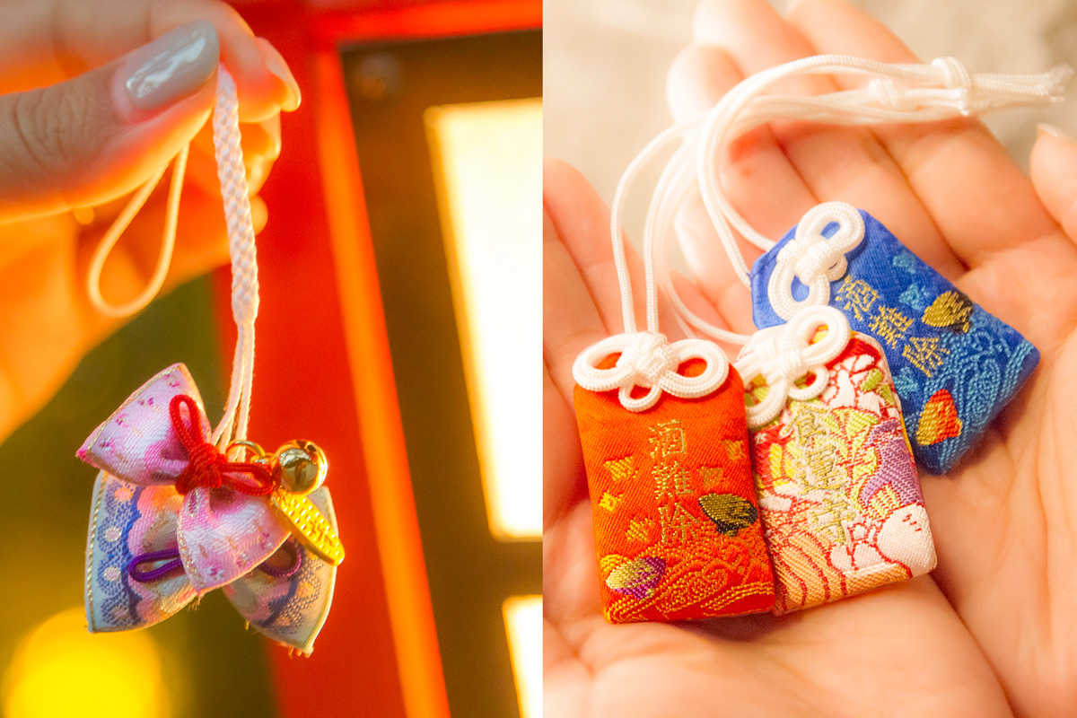 願い事に合わせて50種以上と、お守りもたくさん。写真右の赤・青は酒難除御守り、中央は食運御守り(各600円)で、お酒や食事にまつわるトラブル回避に。写真左は蝶縁結び御守り(800円)で、大小のリボンのようなフォルムがなんともキュートです。御守り授与所は17時までなので、大楠のライトアップを見る前に訪れて。