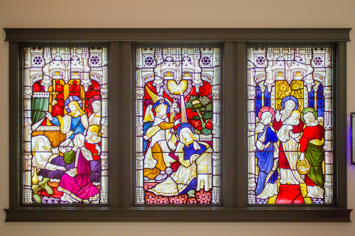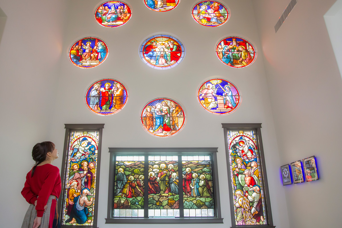 写真上部の円形9枚を使ったバラ窓は、19世紀末頃のフランスの作品「聖母マリアの生涯」。最上部からストーリーが始まり、時計回りに進んで、マリアの幼少期から死後に天で祝福を受ける場面までが描かれています。