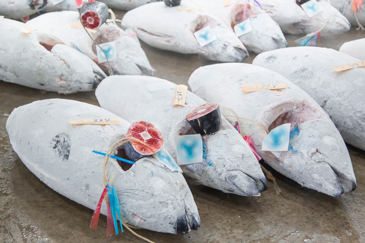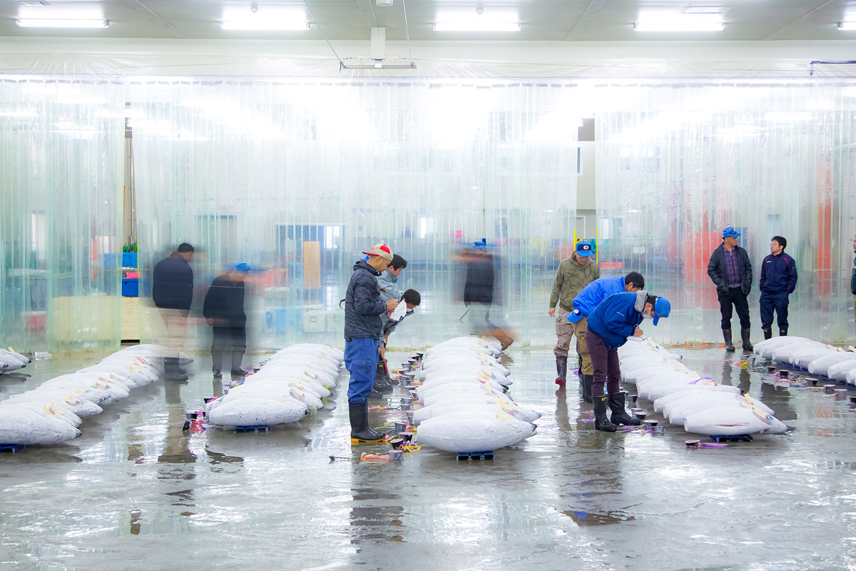 魚市場に登録された仲買人がテール(尾)の断面で脂ののり方、身の質を確認し、どれをいくらで競り落とそうかと真剣な眼差しでチェックしています。