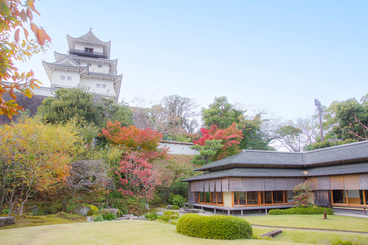 写真は掛川城公園内にある「二の丸茶室」。木造平屋建て、一文字葺の数寄屋造りの建物で、日本庭園とそびえ立つ東海の名城との調和も見事です。