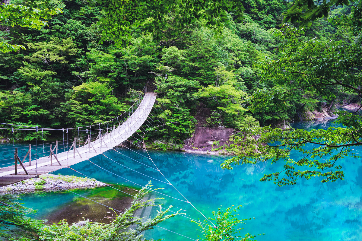 南アルプスあぷとライン奥泉駅からバスで約30分の場所には寸又峡温泉があります。こちらの「夢のつり橋(ゆめのつりばし)」もインスタ映えスポットとして有名です。大間ダムに架かる高さ約8m、長さ約90mの橋で、橋上はエメラルドグリーンの湖上に浮かんでいるみたいでスリル満点。橋の上で願い事をすると恋が叶うというロマンチックな伝説もあるんですよ。