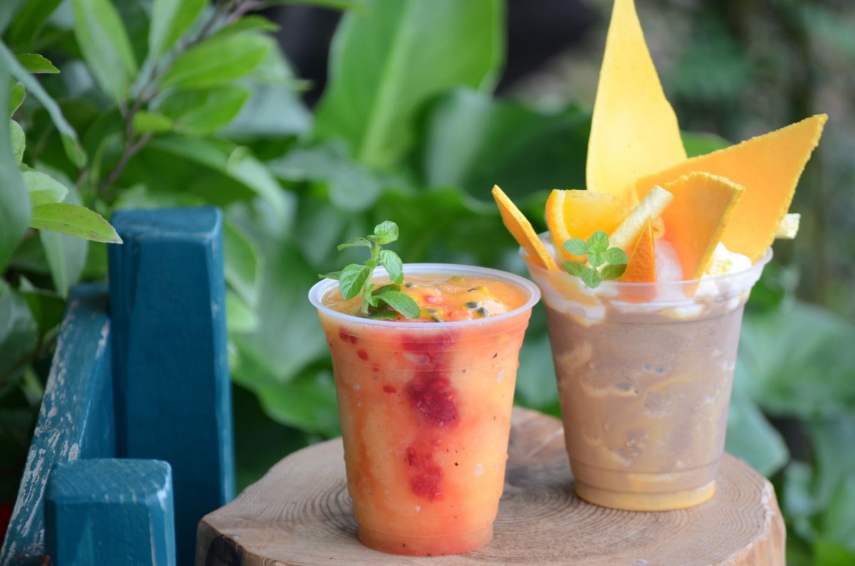 季節のフルーツなどをた〜っぷり使うリッチなドリンクは常時2種類ほど用意。写真は2018年の夏に販売したパッション&マンゴーのドリンク「サンセット(左)」(550円)と、オレンジ&チョコレートの「オレンジホリデー(右)」(650円)。旬素材が旬のうちだけ提供されるドリンクなので、どんなメニューが提供されるかは、店を訪れた時のお楽しみ。