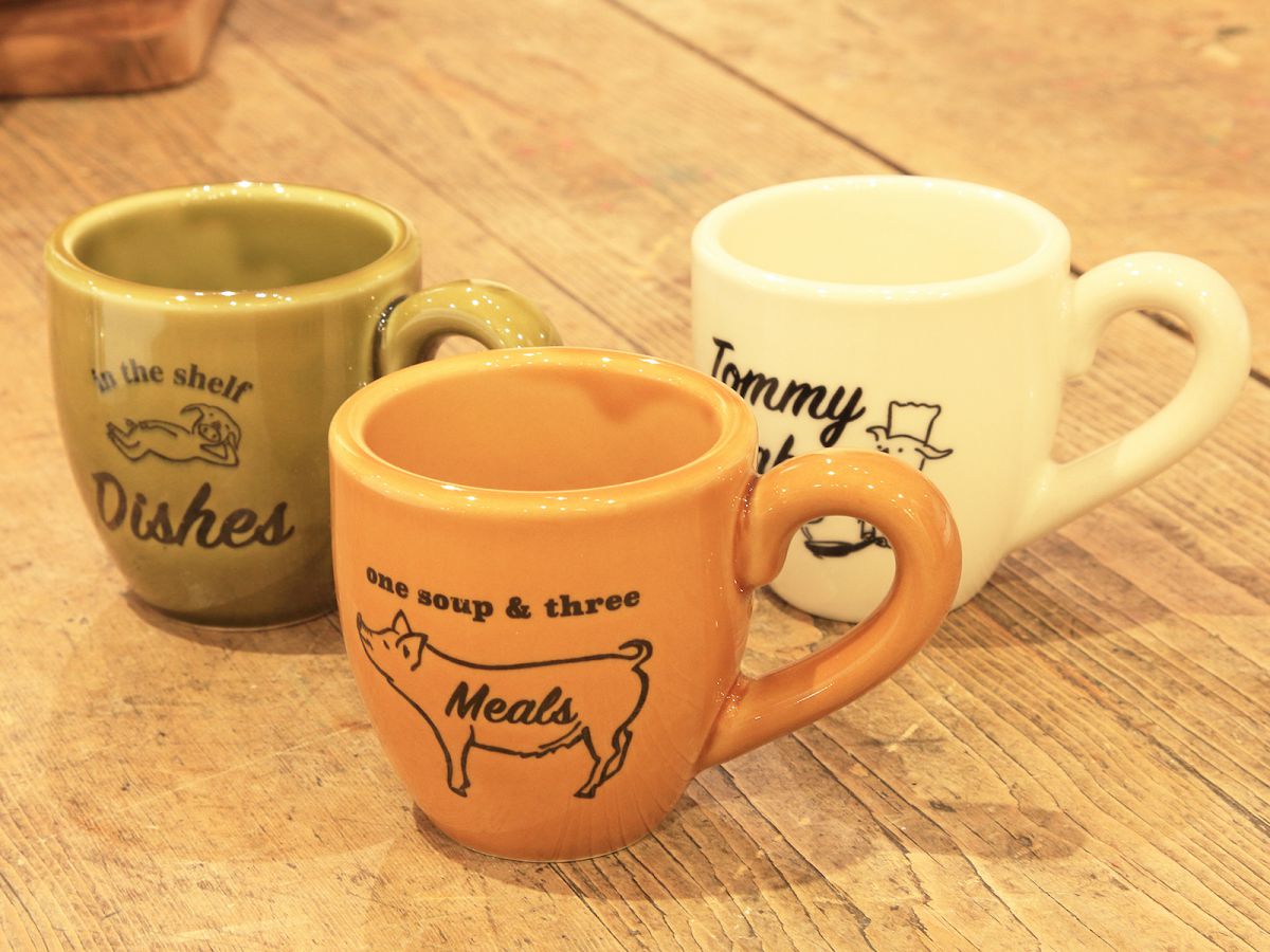 中でも人気の商品は、グリーン、アメ、ホワイトの3種類ある「シッピングマグ」(各1080円)。かわいいブタのイラストとロゴが入っており、マルミツポテリらしい色使いが特徴です。1人暮らしでも3つ揃えたくなりますね。