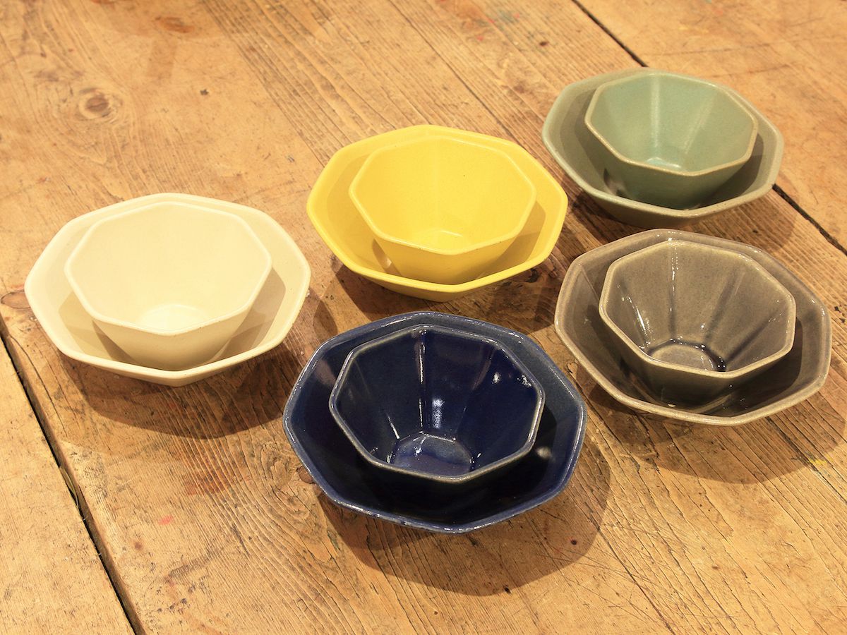 洗練されたデザインでロングセラーとなっている「オクトゴーヌ」シリーズ(3寸小付 各1080円、4.5寸小鉢 各1620円)は、通販でも販売されているホワイト、イエロー、グリーンに加え、店頭限定の藍色と紫もラインナップ。ちょっとしたおかずやフルーツなど、何を盛っても素敵にキマる、汎用性バツグンの器ですよ。