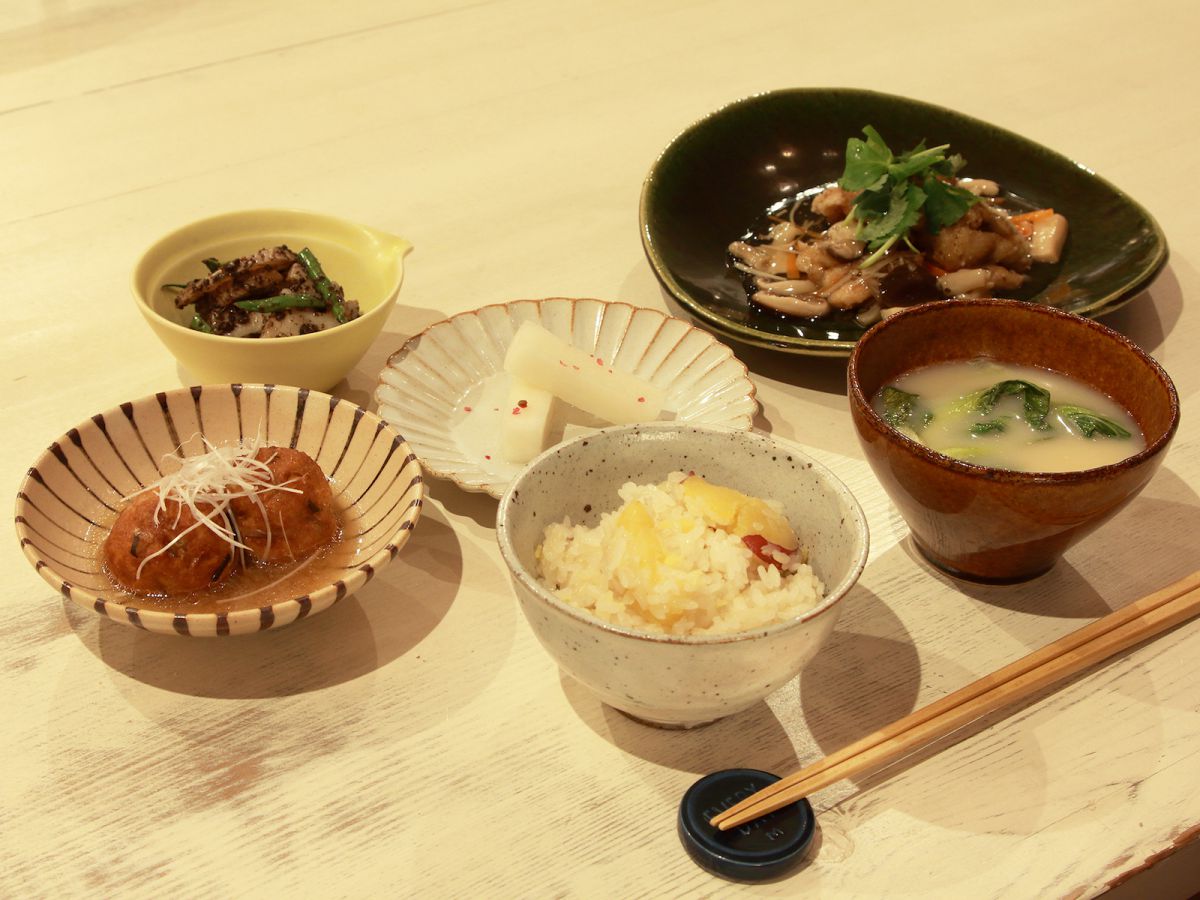 今回は、メインのおかずが「揚げ鶏のきのこあんかけ」になった「meal A」をいただきます。「チンゲン菜の白味噌スープ」や「蓮根のひじき味噌和え」「さつま芋のおこわ」などが副菜として付いています。奇をてらわない家庭料理のメニューは丁寧に作られていて、優しいお味。とてもほっこりした気分になれます。